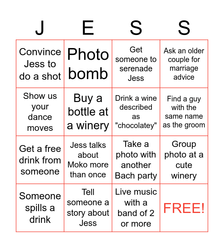 This bingo card has 16 words: Tell someone a story about Jess, Group photo at a cute winery, Get someone to serenade Jess, Convince Jess to do a shot, Get a free drink from someone, Photo bomb, Take a photo with another Bach party, Live music with a band of 2 or more, Show us your dance moves, Buy a bottle at a winery, Someone spills a drink, Ask an older couple for marriage advice, Jess talks about Moko more than once, Find a guy with the same name as the groom, Drink a wine described as "chocolatey" and FREE!.