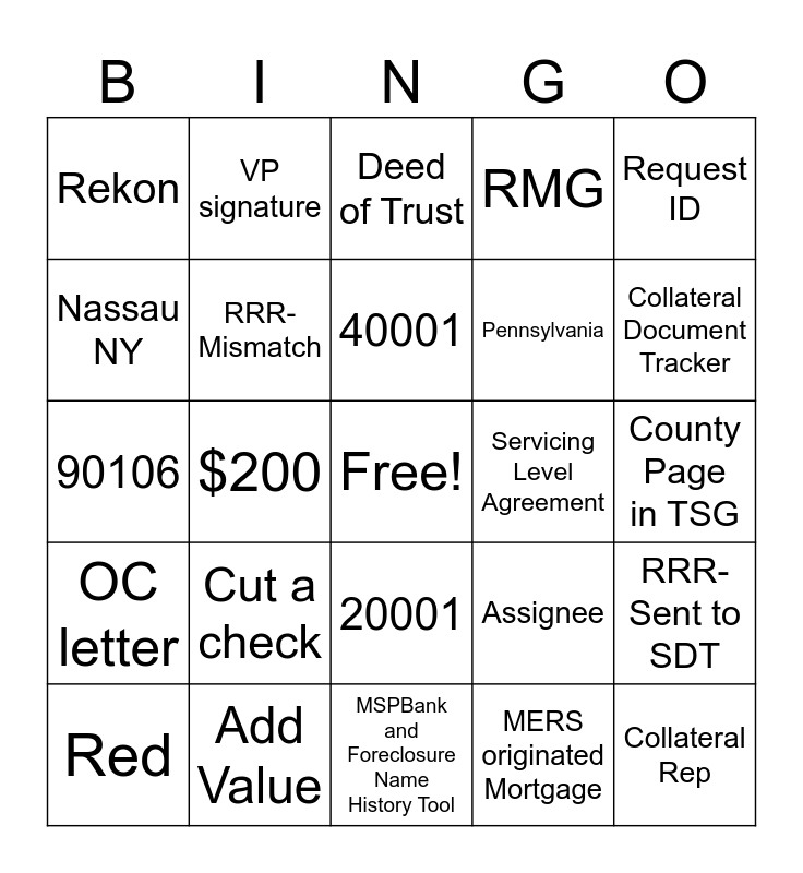 This bingo card has a free space and 38 words: 89901, RRR-Ship2Custodian, 5000, 6000, 9000, RRR-Mismatch, RRR-Sent to SDT, Cut a check, 40001, Simplifile, Request ID, Pennsylvania, $200, RMG, Collateral Rep, County Page in TSG, Nassau NY, OC letter, Officer Certificate, Deed of Trust, FileTrail, Servicing Level Agreement, Rekon, Add Value, Collateral Document Tracker, Red, Document Retrieval, MSPBank and Foreclosure Name History Tool, County Requirements, RRR, MERS, 30001, Select CE, 20001, MERS originated Mortgage, VP signature, Every Thursday, Assignee, 90106 and Exhibit A schedule.