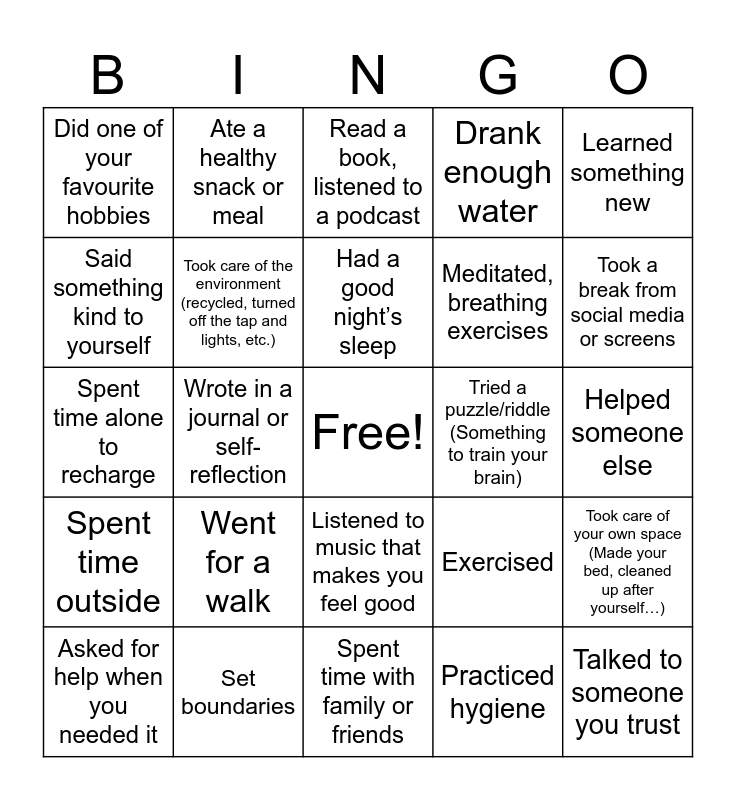 This bingo card has a free space and 24 words: Went for a walk, Set boundaries, Had a good night’s sleep, Asked for help when you needed it, Learned something new, Did one of your favourite hobbies, Said something kind to yourself, Ate a healthy snack or meal, Tried a puzzle/riddle (Something to train your brain), Listened to music that makes you feel good, Meditated, breathing exercises, Spent time alone to recharge, Exercised, Took care of your own space (Made your bed, cleaned up after yourself…), Took care of the environment (recycled, turned off the tap and lights, etc.), Practiced hygiene, Helped someone else, Read a book, listened to a podcast, Took a break from social media or screens, Wrote in a journal or self-reflection, Talked to someone you trust, Spent time outside, Drank enough water and Spent time with family or friends.