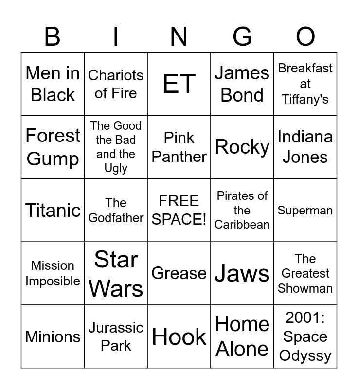 This bingo card has a free space and 24 words: Star Wars, Jurassic Park, Pink Panther, Minions, Breakfast at Tiffany's, Men in Black, Forest Gump, Chariots of Fire, Pirates of the Caribbean, Grease, Rocky, Titanic, Jaws, The Greatest Showman, The Good the Bad and the Ugly, Home Alone, Superman, ET, Indiana Jones, The Godfather, 2001: Space Odyssy, Mission Imposible, James Bond and Hook.
