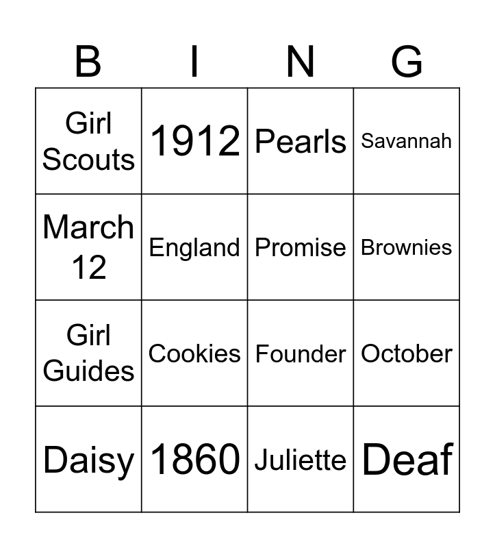 This bingo card has 17 words: Juliette, Daisy, Pearls, Girl Scouts, Cookies, Savannah, October, Promise, Brownies, England, 1860, Founder, March 12, 1912, Girl Guides, Lord Baden-Powell and Deaf.