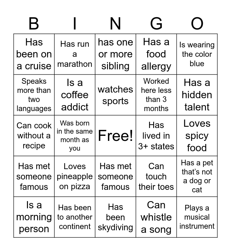 This bingo card has a free space and 24 words: Loves pineapple on pizza, Has been to another continent, watches sports, Is a morning person, Is wearing the color blue, Has been on a cruise, Speaks more than two languages, Has run a marathon, Has lived in 3+ states, Has met someone famous, Worked here less than 3 months, Can cook without a recipe, Can touch their toes, Has a pet that’s not a dog or cat, Is a coffee addict, Can whistle a song, Loves spicy food, has one or more sibling, Has a hidden talent, Was born in the same month as you, Plays a musical instrument, Has met someone famous, Has a food allergy and Has been skydiving.