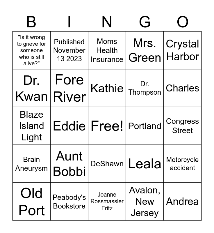 This bingo card has a free space and 24 words: Aunt Bobbi, Peabody's Bookstore, Kathie, Old Port, Crystal Harbor, "Is it wrong to grieve for someone who is still alive?", Dr. Kwan, Published November 13 2023, Portland, DeShawn, Dr. Thompson, Blaze Island Light, Leala, Motorcycle accident, Fore River, Avalon, New Jersey, Congress Street, Moms Health Insurance, Charles, Eddie, Andrea, Brain Aneurysm, Mrs. Green and Joanne Rossmassler Fritz.