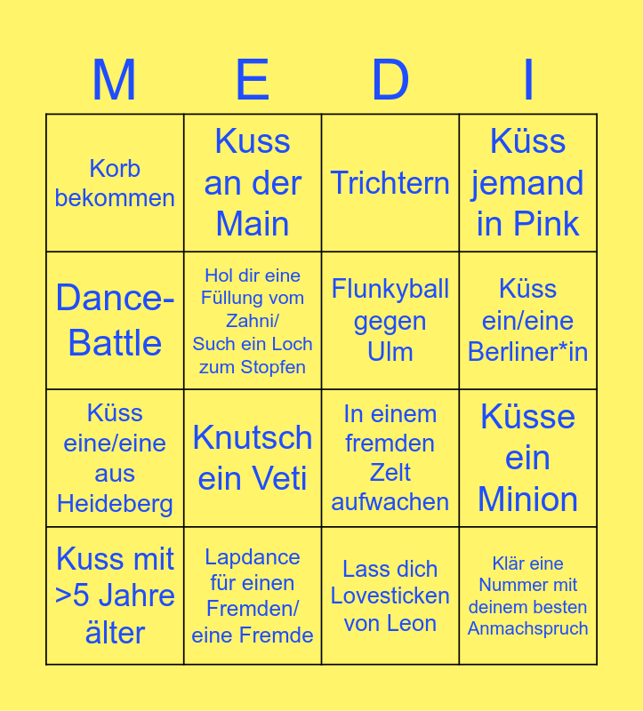 This bingo card has 16 words: Lapdance für einen Fremden/ eine Fremde, Küsse ein Minion, Trichtern, Korb bekommen, Küss eine/eine aus Heideberg, Kuss an der Main, In einem fremden Zelt aufwachen, Lass dich Lovesticken von Leon, Dance-Battle, Hol dir eine Füllung vom Zahni/ Such ein Loch zum Stopfen, Kuss mit >5 Jahre älter, Küss jemand in Pink, Knutsch ein Veti, Küss ein/eine Berliner*in, Flunkyball gegen Ulm and Klär eine Nummer mit deinem besten Anmachspruch.