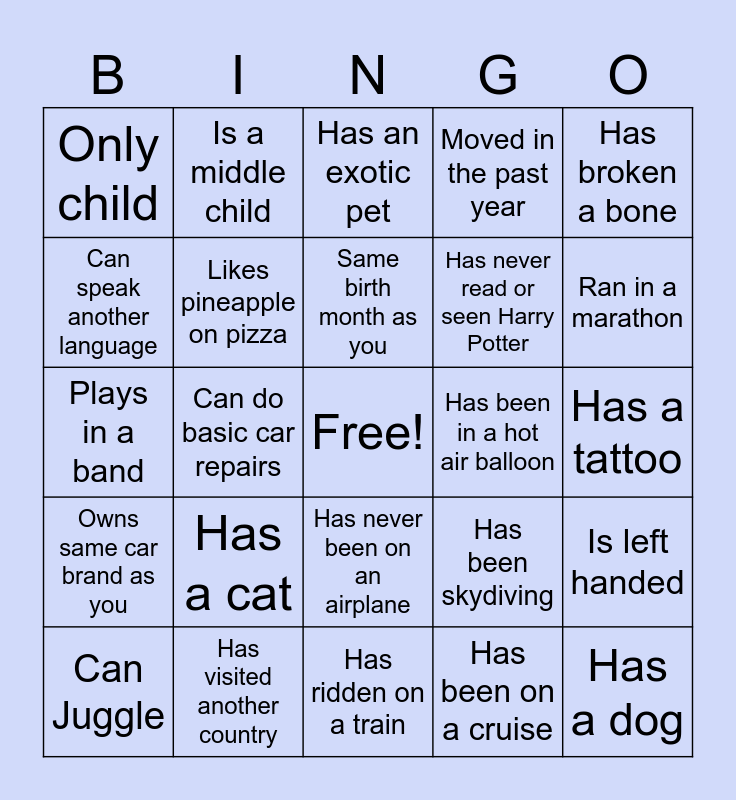 This bingo card has a free space and 36 words: Met a celebrity, Can do a cartwheel, Been on a blind date, Likes pineapple on pizza, Has been skydiving, Owns same car brand as you, Same birth month as you, Collects something, Has broken a bone, Can bake a cake from scratch, Can do basic car repairs, Moved in the past year, Can drive stick, Has been in a hot air balloon, Ran in a marathon, Only child, Plays an instrument, Has a cat, Has a dog, Has an exotic pet, Has a tattoo, Is left handed, Has visited another country, Can Juggle, Has ridden on a train, Is a middle child, Plays in a band, Has a birthday this month, Has never read or seen Harry Potter, Can speak another language, Can solve a Rubik’s cube, Prefers tea over coffee, Has been on a cruise, Has never been on an airplane, Has worked in a restaurant and Has never been to a concert.