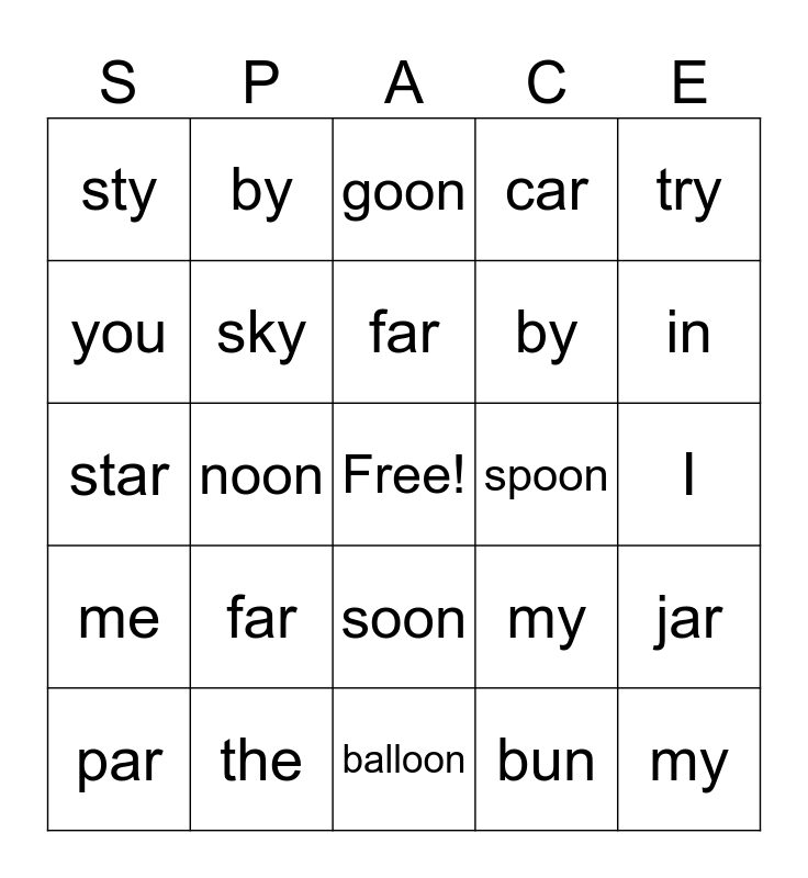 This bingo card has a free space and 40 words: moon, star, sun, sky, the, soon, far, fun, try, me, noon, car, my, I, spoon, far, run, sty, and, goon, jar, bun, by, you, and, goon, tar, spun, try, you, loon, par, shun, my, in, balloon, art, pun, by and is.