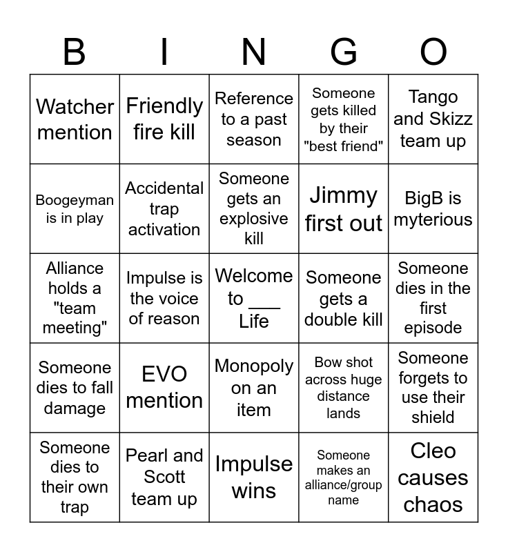 This bingo card has a free space and 24 words: EVO mention, Pearl and Scott team up, Someone gets an explosive kill, Someone dies to their own trap, Tango and Skizz team up, Watcher mention, Boogeyman is in play, Friendly fire kill, Someone gets a double kill, Monopoly on an item, Jimmy first out, Alliance holds a "team meeting", Bow shot across huge distance lands, Someone forgets to use their shield, Accidental trap activation, Someone makes an alliance/group name, Someone dies in the first episode, Reference to a past season, BigB is myterious, Impulse is the voice of reason, Cleo causes chaos, Someone dies to fall damage, Someone gets killed by their "best friend" and Impulse wins.