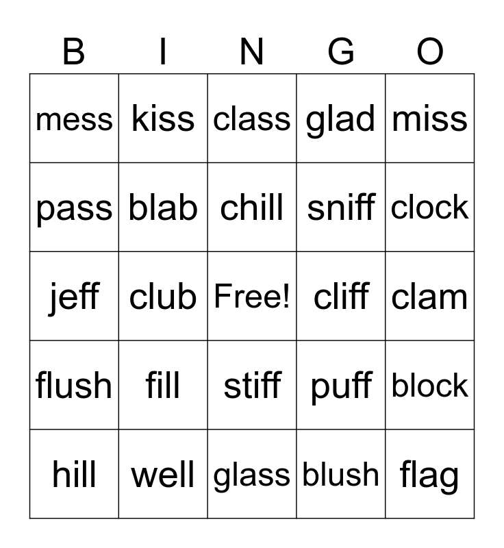 This bingo card has a free space and 24 words: fill, well, chill, hill, miss, mess, pass, kiss, cliff, stiff, sniff, jeff, puff, block, blab, blush, clam, class, clock, club, flag, flush, glad and glass.