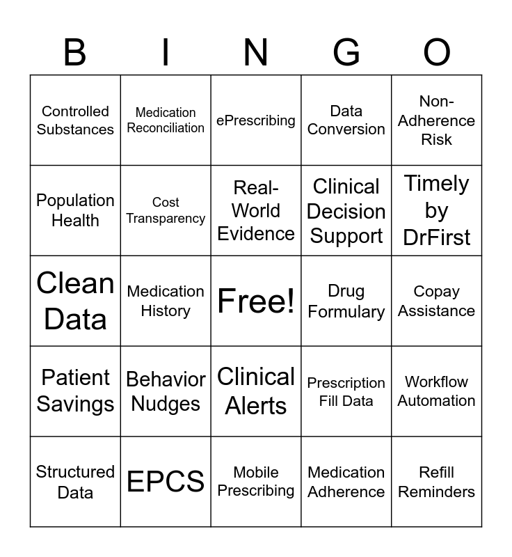This bingo card has a free space and 30 words: EPCS, PDMP, Medication History, Prior Authorization, Controlled Substances, ePrescribing, Cost Transparency, Clinical Alerts, Drug Formulary, Mobile Prescribing, Copay Assistance, Refill Reminders, Medication Adherence, Patient Education, Timely by DrFirst, SMS Reminders, Prescription Fill Data, Patient Savings, Behavior Nudges, Non-Adherence Risk, Clean Data, AI-Powered Insights, Medication Reconciliation, Clinical Decision Support, Population Health, Data Conversion, Workflow Automation, Structured Data, Real-World Evidence and Outcome Tracking.
