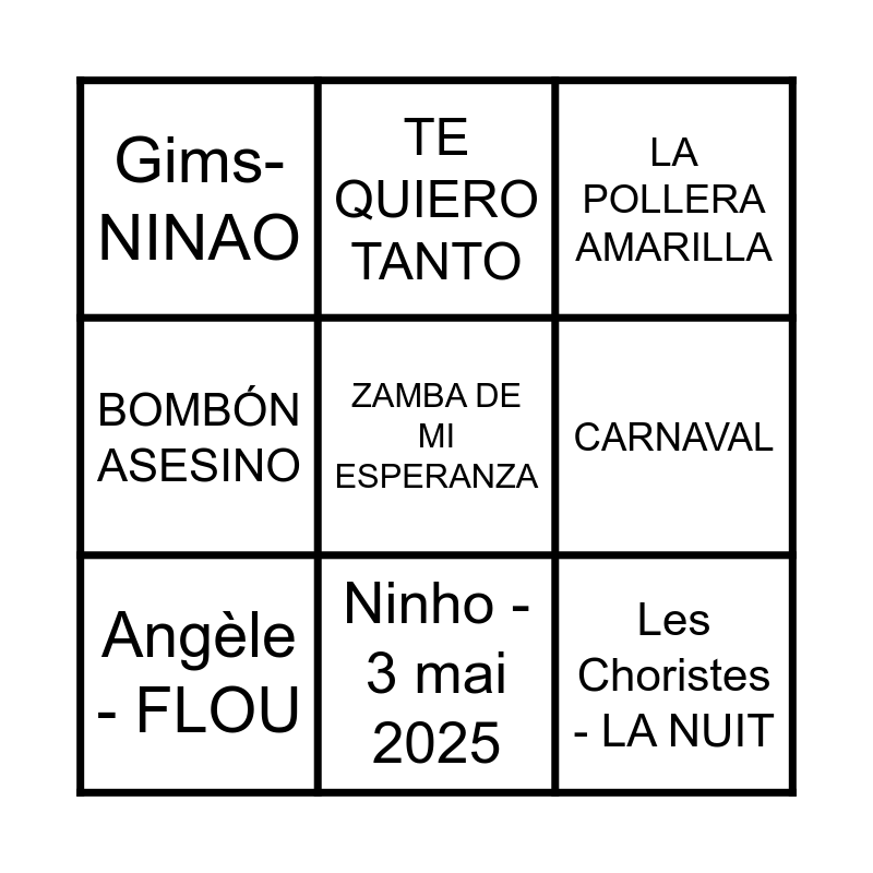 This bingo card has a free space and 46 words: LUNA TUCUMANA, GARGANTA CON ARENA, ROSA, ROSA, A DON ATA, MI BUENOS AIRES QUERIDO, A MI MANERA, TE QUIERO TANTO, PEGA LA VUELTA, AMOR SALVAJE, QUE NADIE SEPA MI SUFRIR, LA POLLERA AMARILLA, BOMBÓN ASESINO, ZAMBA PARA OLVIDARTE, ETERNO AMOR, VIVIR ASÍ ES MORIR DE AMOR, DESPEINADA, CARNAVAL, MARINERO DE LUCES, DAME FUEGO, Angèle - FLOU, Angèle - OUI ET NON, Gims - LAISSEZ PASSER, Gims- NINAO, MHD - LA PUISSANCE, Indila - DERNIÈRE DANSE, Gims - SOIS PAS TIMIDE, Vita et Slimane - ÇA IRA, Gims - EST-CE QUE TU M’AIMES?, Barbara Pravi - VOILÀ, Ninho - LA VIE QU’ON MÈNE, Kids united - LES LIENS DE L’AMITIÉ, Louane - NO, Videoclub - AMOUR PLASTIQUE, Gims & Dystinct - SPYDER, Clara Luciani - LA GRENADE, Angèle - LIBRE, Videoclub - ROI, Louane - JE VOLE, SDM - BOLIDE ALLEMAND, Indila - PARLE À TA TÊTE, Gims & Lossa - LOCO, Ninho - 3 mai 2025, Les Choristes - LA NUIT, MHD - FAIS LE MOUV, Werenoi - CHEMIN D’OR and MHD - CHAMPIONS LEAGUE.
