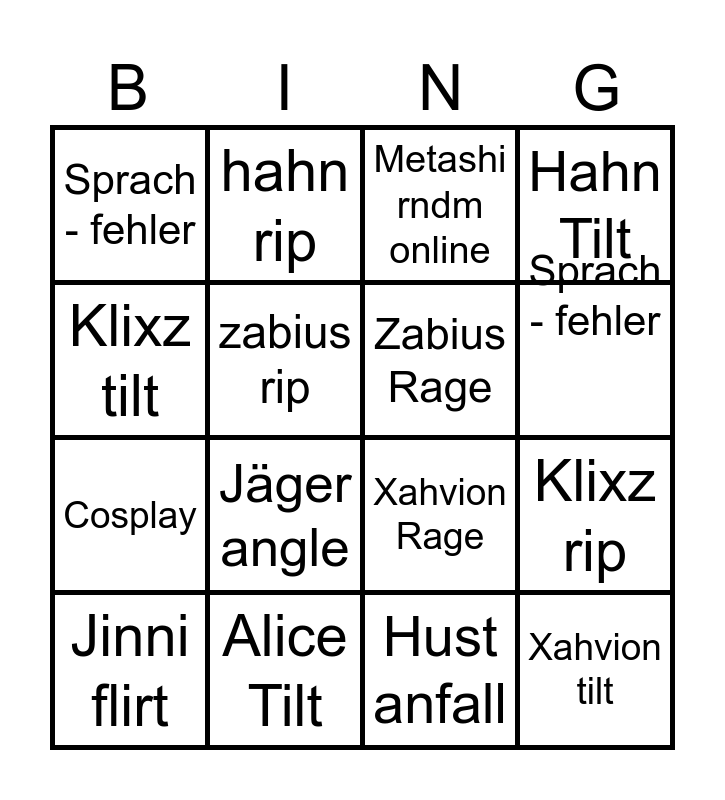 ⚠ This card has duplicate items: hahn rip (2), zabius rip (2), Klixz rip (2), alice rip (2), xahvion rip (2), hahn rage (2), Zabius Rage (2), Klixz Rage (2), Klixz tilt (2), Alice Rage (2), Xahvion Rage (2), Hahn Tilt (2), Zabius tilt (2), Alice Tilt (2), Xahvion tilt (2), Skibidi wäähh (2), Cosplay (2), Jäger angle (2), Bier angle (2), Sprach - fehler (2)