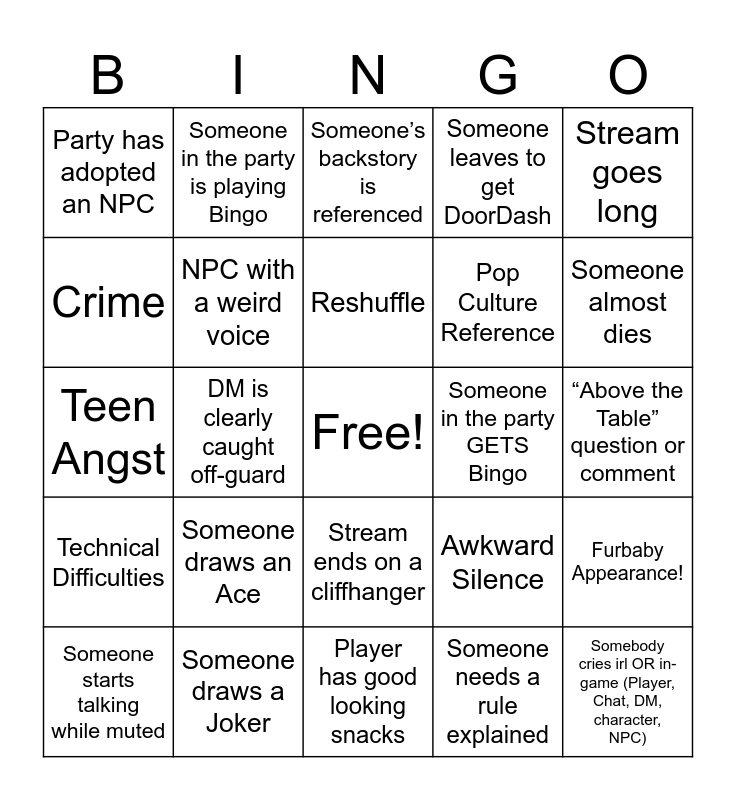 This bingo card has a free space and 24 words: Someone draws an Ace, Someone draws a Joker, Reshuffle, Someone starts talking while muted, Stream goes long, Party has adopted an NPC, Crime, Someone in the party is playing Bingo, Someone in the party GETS Bingo, Stream ends on a cliffhanger, Pop Culture Reference, Teen Angst, Awkward Silence, Furbaby Appearance!, NPC with a weird voice, Someone needs a rule explained, “Above the Table” question or comment, Someone’s backstory is referenced, Someone almost dies, DM is clearly caught off-guard, Somebody cries irl OR in-game (Player, Chat, DM, character, NPC), Technical Difficulties, Someone leaves to get DoorDash and Player has good looking snacks.