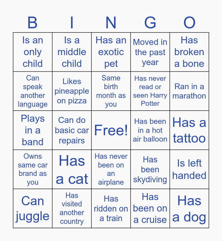 This bingo card has a free space and 36 words: Met a celebrity, Can do a cartwheel, Been on a blind date, Likes pineapple on pizza, Has been skydiving, Owns same car brand as you, Same birth month as you, Collects something, Has broken a bone, Can bake a cake from scratch, Can do basic car repairs, Moved in the past year, Can drive manual car, Has been in a hot air balloon, Ran in a marathon, Is an only child, Plays an instrument, Has a cat, Has a dog, Has an exotic pet, Has a tattoo, Is left handed, Has visited another country, Can juggle, Has ridden on a train, Is a middle child, Plays in a band, Has a birthday this month, Has never read or seen Harry Potter, Can speak another language, Can solve a Rubik’s cube, Prefers tea over coffee, Has been on a cruise, Has never been on an airplane, Has worked in a restaurant and Has never been to a concert.