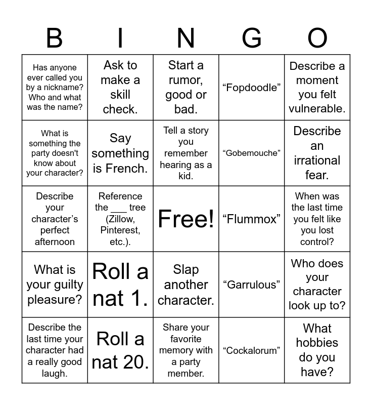 This bingo card has a free space and 50 words: Describe a childhood rival., Roll a nat 20., Describe a moment you felt like a villain., “Respair”, When was the last time you felt like you lost control?, Describe a childhood friend., Ask to make a skill check., What’s your character’s favorite food?, “Gobemouche”, Now that you’ve seen Malakar in the flesh, are you afraid?, Has anyone ever called you by a nickname? Who and what was the name?, Say something is French., Share your favorite memory with a party member., “Cockalorum”, Say you go your separate way from the party. What would you do?, What is something your character is trying to improve about themselves?, Reference the ___ tree (Zillow, Pinterest, etc.)., Tell a story you remember hearing as a kid., “Quixotic”, Describe a moment you felt vulnerable., Describe your character’s perfect afternoon, Reference the polycule., Start a rumor, good or bad., “Flummox”, Has your character ever told anyone that you love them?, What is your guilty pleasure?, Roll a nat 1., Come up with a signature catchphrase., “Fopdoodle”, Who does your character look up to?, Describe your characters most recent nightmare., Borrow a die for a big roll., Write a letter to someone., “Blandish”, Who are you scared to become like?, Describe the last time your character had a really good laugh., Lend someone a die for a big roll., Have a conjoined dream with another character., “Sparple”, Describe an irrational fear., What is something your character regrets?, Miss on an attack roll., Slap another character., “Presiflage”, What hobbies do you have?, What is something the party doesn't know about your character?, Land an attack roll., Read another character for filth., “Garrulous” and Describe a moment you felt like a hero..
