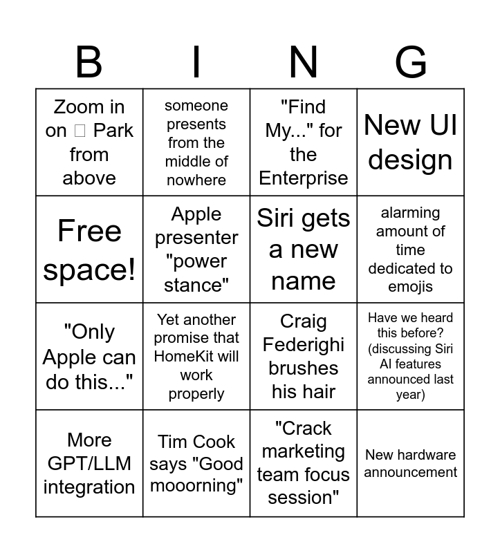 This bingo card has 16 words: Tim Cook says "Good mooorning", Have we heard this before? (discussing Siri AI features announced last year), "Find My..." for the Enterprise, Zoom in on Park from above, "Only Apple can do this...", someone presents from the middle of nowhere, Craig Federighi brushes his hair, "Crack marketing team focus session", Free space!, Apple presenter "power stance", More GPT/LLM integration, New UI design, Yet another promise that HomeKit will work properly, alarming amount of time dedicated to emojis, Siri gets a new name and New hardware announcement.
