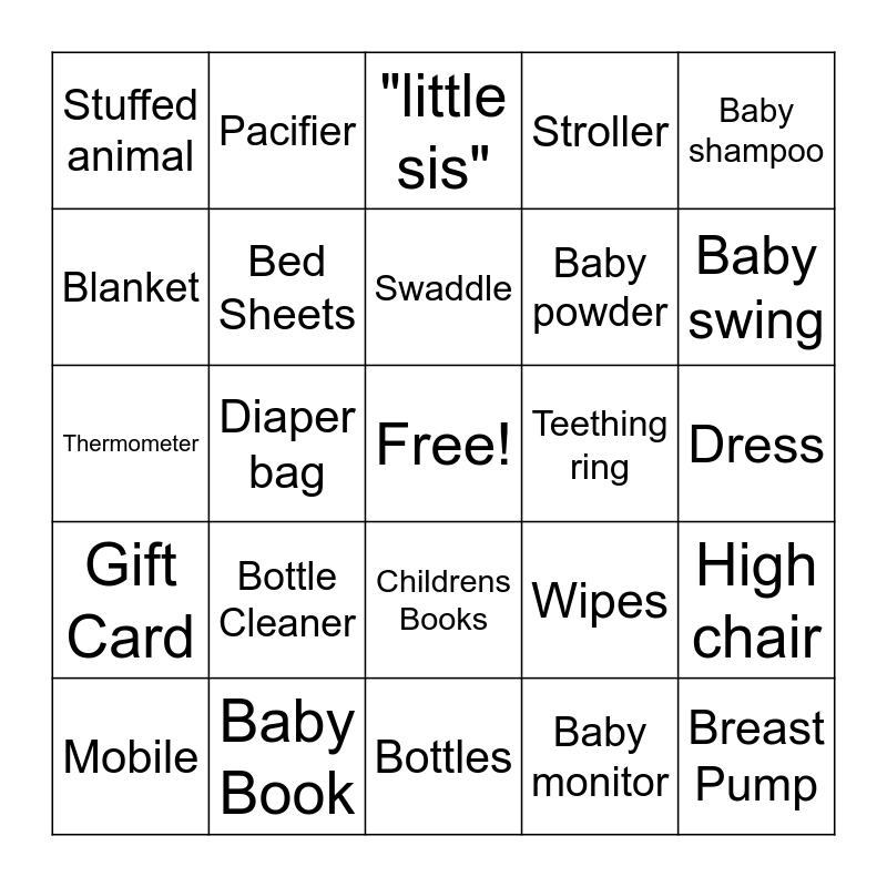 This bingo card has a free space and 48 words: Bassinet, Breast Pump, Baby Carrier, Bottles, Bottle Cleaner, Onesie, Pacifier, Bib, Blanket, Burp cloth, Bed Sheets, Stroller, High chair, Wipes, Rattle, Socks, Swaddle, Teething ring, Baby lotion, Baby shampoo, Diaper bag, Baby monitor, Stuffed animal, Baby powder, Sleep sack, Baby swing, Mobile, Sippy cup, Childrens Books, Gift Card, Hospital bag, Musical, Shower Toys, Milestone Book, Baby Book, Growth Chart, Diaper Rash Cream, Dress, Hairbands, Booties/Shoes, Bath Chair, Spoons/Plates/etc., "little sis", Tummy Time Mats, Thermometer, Bottle Warmer, Playmat and Medicine Dispenser.