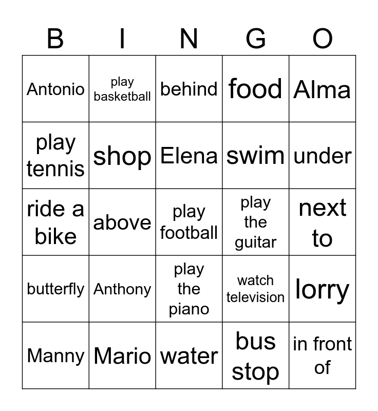 This bingo card has a free space and 24 words: Anthony, Mario, Elena, Manny, Alma, Antonio, play tennis, play basketball, play the guitar, play the piano, swim, ride a bike, watch television, lorry, shop, bus stop, next to, behind, under, above, in front of, butterfly, food and water.