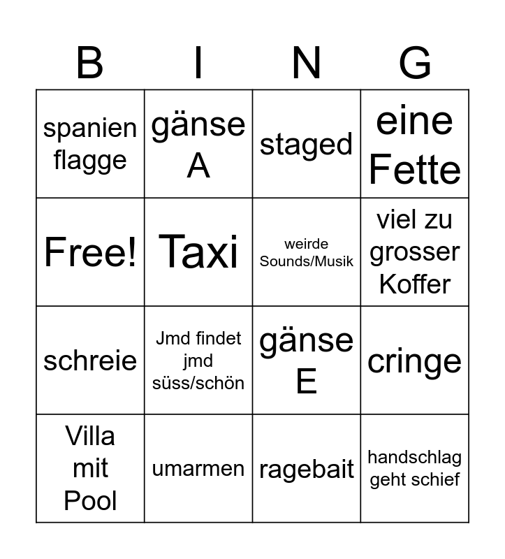 This bingo card has 16 words: umarmen, cringe, staged, spanien flagge, schreie, gänse A, gänse E, ragebait, Free!, Taxi, Villa mit Pool, eine Fette, Jmd findet jmd süss/schön, viel zu grosser Koffer, weirde Sounds/Musik and handschlag geht schief.