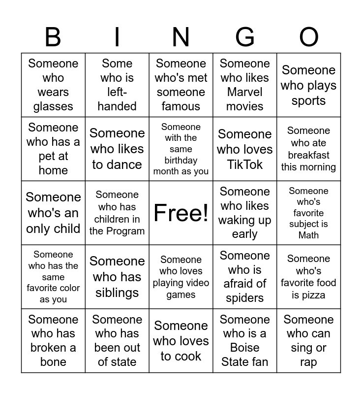 This bingo card has a free space and 24 words: Someone who has siblings, Someone who has been out of state, Someone with the same birthday month as you, Someone who has broken a bone, Someone who plays sports, Someone who wears glasses, Someone who has a pet at home, Some who is left-handed, Someone who likes waking up early, Someone who loves playing video games, Someone who loves TikTok, Someone who's an only child, Someone who is afraid of spiders, Someone who's favorite food is pizza, Someone who likes to dance, Someone who is a Boise State fan, Someone who's favorite subject is Math, Someone who's met someone famous, Someone who ate breakfast this morning, Someone who has children in the Program, Someone who can sing or rap, Someone who has the same favorite color as you, Someone who likes Marvel movies and Someone who loves to cook.