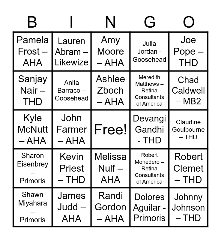This bingo card has a free space and 24 words: Kevin Priest – THD, James Judd – AHA, Ashlee Zboch – AHA, Shawn Miyahara – Primoris, Joe Pope – THD, Pamela Frost – AHA, Sanjay Nair – THD, Lauren Abram – Likewize, Devangi Gandhi - THD, Melissa Nulf – AHA, Meredith Matthews – Retina Consultants of America, Kyle McNutt – AHA, Robert Monedero – Retina Consultants of America, Robert Clemet – THD, Anita Barraco – Goosehead, Dolores Aguilar - Primoris, Claudine Goulbourne – THD, Amy Moore – AHA, Chad Caldwell – MB2, John Farmer – AHA, Johnny Johnson – THD, Sharon Eisenbrey – Primoris, Julia Jordan - Goosehead and Randi Gordon – AHA.