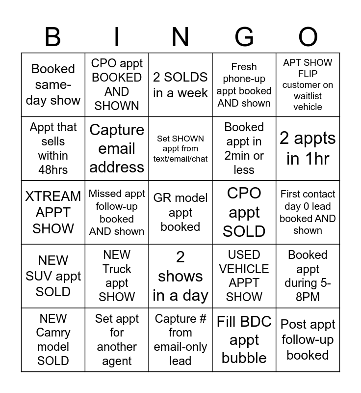 This bingo card has 25 words: NEW Truck appt SHOW, Capture # from email-only lead, Set SHOWN appt from text/email/chat, NEW Camry model SOLD, APT SHOW FLIP customer on waitlist vehicle, Booked same-day show, Appt that sells within 48hrs, CPO appt BOOKED AND SHOWN, CPO appt SOLD, 2 shows in a day, Booked appt in 2min or less, XTREAM APPT SHOW, USED VEHICLE APPT SHOW, Booked appt during 5-8PM, Capture email address, Post appt follow-up booked, First contact day 0 lead booked AND shown, 2 SOLDS in a week, 2 appts in 1hr, Missed appt follow-up booked AND shown, GR model appt booked, Set appt for another agent, NEW SUV appt SOLD, Fresh phone-up appt booked AND shown and Fill BDC appt bubble.