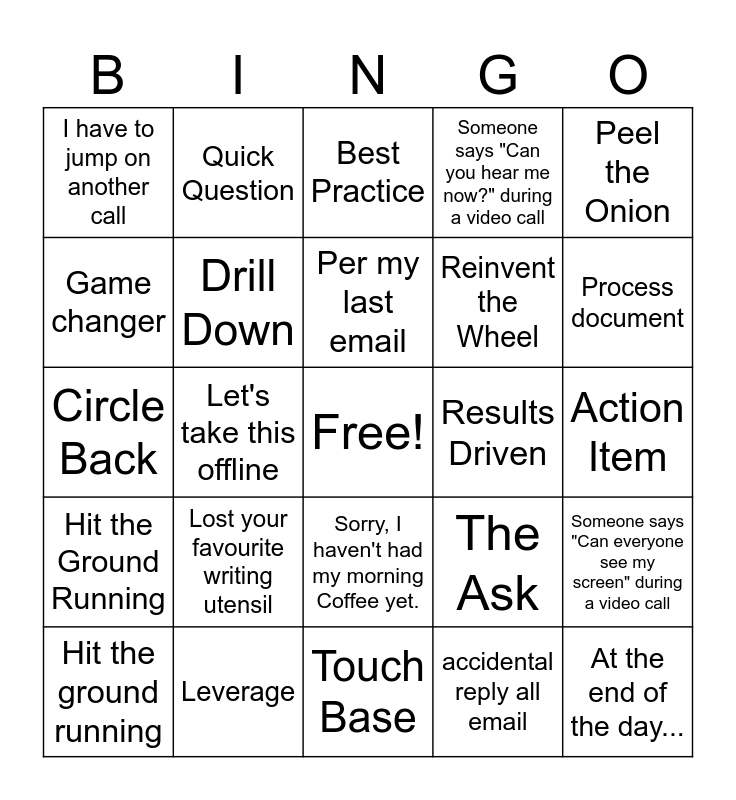 This bingo card has a free space and 45 words: Out of the Loop, At the end of the day..., Lots of Moving Parts, Hit the ground running, "next slide please", accidental reply all email, Best Practice, Scalable, Peel the Onion, Leverage, Someone says "Can you hear me now?" during a video call, Results Driven, Sorry, I haven't had my morning Coffee yet., Lost your favourite writing utensil, Synergize, Touch Base, Sustainability, Circle Back, Good Point, Process document, Quick Question, It's on my radar, Think outside the box, I have to jump on another call, Value Added, Action Item, The ask, Happy *Day of the week*, The Ask, Hit the Ground Running, Out of the Loop, Someone says "Can everyone see my screen" during a video call, Someone says "You're on mute" during a video call, Low hanging Fruit, Game Plan, Let's take this offline, Used an emoji in an email, Someone complains about the office temperature, It is what it is, Per my last email, Game changer, Reinvent the Wheel, Deep Dive, Drill Down and Jot that on a sticky note.