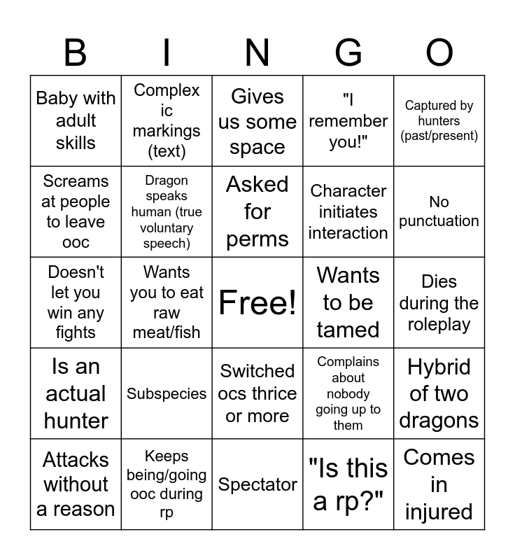 This bingo card has a free space and 44 words: Character waits for us to initiate interaction, Comes in injured, Orphan, Attacks without a reason, (Tries to) overwrite current plot, "Is this a rp?", Gives us some space, Dragon/Rider pair, Captured by hunters (past/present), Keeps being/going ooc during rp, "I remember you!", Wants to be tamed, Switched ocs thrice or more, Subspecies, Violent then friendly, Spectator, Thesaurus-style words, Doesn't let you win any fights, Loredumps/Forces their lore in scene, No punctuation, Complex ic markings (text), Wants us to ride them, Dragon/human understanding the other's language, Baby with adult skills, Friendly then violent, Dies during the roleplay, Kidnaps one of us, Armor is not armor, Complains about nobody going up to them, Is an actual hunter, Immune to venom that isn't from their species, Hybrid of two dragons, Uses player-based/meta knowledge, 14-years-old or younger, Wants you to eat raw meat/fish, Dragon/Dragon pair, Human/Human pair, Interaction not centered around human.s (if human.s in rp), Asked for perms, Screams at people to leave ooc, Character initiates interaction, Unreadably small bio, Dragon speaks human (true voluntary speech) and Human speaks dragon (true voluntary speech).
