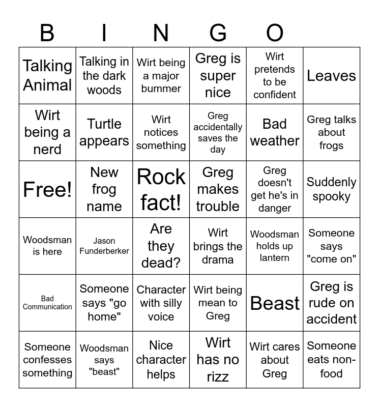 This bingo card has 36 words: Wirt being mean to Greg, Character with silly voice, Wirt has no rizz, Wirt being a nerd, Woodsman is here, Greg makes trouble, Turtle appears, Nice character helps, Wirt pretends to be confident, Beast, Greg talks about frogs, Greg is super nice, Greg is rude on accident, New frog name, Greg accidentally saves the day, Talking Animal, Bad Communication, Greg doesn't get he's in danger, Free!, Wirt being a major bummer, Rock fact!, Jason Funderberker, Wirt brings the drama, Are they dead?, Woodsman holds up lantern, Talking in the dark woods, Bad weather, Woodsman says "beast", Wirt notices something, Leaves, Someone eats non-food, Someone confesses something, Someone says "come on", Suddenly spooky, Someone says "go home" and Wirt cares about Greg.