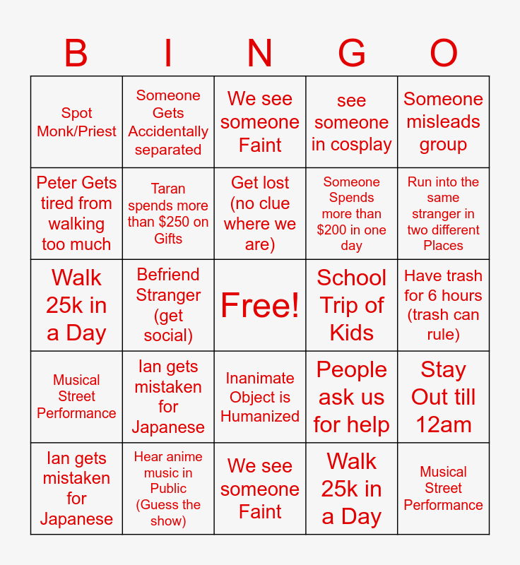 This bingo card has a free space and 61 words: Someone Photobombs Us, Ian gets mistaken for Japanese, See Barely Clothed Anime Girl, Taran's Food drops while using Chopsticks, Have trash for 6 hours (trash can rule), Stupidly Mistranslated Shirt in English, Taran spends more than $250 on Gifts, Someone misleads group, School Trip of Kids, Taran Can't eat Anything on Menu, Peter Gets tired from walking too much, See Femboy or Maid Girl, Someone Spends more than $200 in one day, Musical Street Performance, Stay Out till 12am, Someone Gets Accidentally separated, Get lost (no clue where we are), see someone in cosplay, Taran Accidently Eats Something he Shouldn’t, Walk 25k in a Day, Befriend Stranger (get social), We see someone Faint, Any of us get hit on, Run into the same stranger in two different Places, See Barely Clothed Anime Girl, Taran's Food drops while using Chopsticks, Inanimate Object is Humanized, Goofy Ahh Fashion (Group Agrees), Someone misleads group, Peter accidentally walks into an Object, School Trip of Kids, Stupidly Mistranslated Shirt in English, Taran can't eat Anything on the Menu, Peter gets tired from walking too much, Spot Monk/Priest, See Femboy or Maid Girl, Someone spends more than $200 in one day, People ask us for help, Stranger Says “Kawaii”, Musical Street Performance, Spot a Homeless Person, We see someone Faint, Walk 25k in a Day, Taran accidentally eats Something he shouldn’t, Befriend Stranger (get social), See vehicle or bike accident, Any of us gets hit on, A stranger gives us a gift, Shitty Anime Merch, Ian gets mistaken for Japanese, Hear anime music in Public (Guess the show), Stranger terribly mispronounces word, Get lost (no clue where we are), Stay Out till 12am, Meet someone Famous, Taran spends more than $250 on Gifts, Someone Photobombs Us, Spot Monk/Priest, Find hidden Shrine, Someone Gets Accidentally separated and Funny NPC interactions.