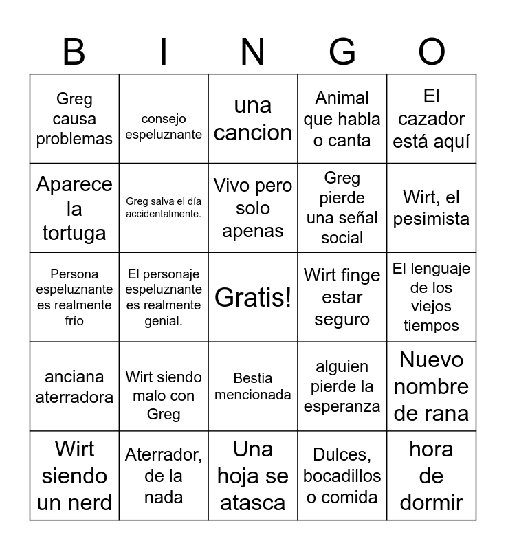This bingo card has a free space and 24 words: Wirt siendo malo con Greg, Aterrador, de la nada, Vivo pero solo apenas, Wirt siendo un nerd, El cazador está aquí, Greg causa problemas, Aparece la tortuga, consejo espeluznante, Wirt finge estar seguro, Bestia mencionada, Greg pierde una señal social, Persona espeluznante es realmente frío, alguien pierde la esperanza, Nuevo nombre de rana, Greg salva el día accidentalmente., Dulces, bocadillos o comida, El lenguaje de los viejos tiempos, una cancion, Wirt, el pesimista, El personaje espeluznante es realmente genial., hora de dormir, anciana aterradora, Animal que habla o canta and Una hoja se atasca.