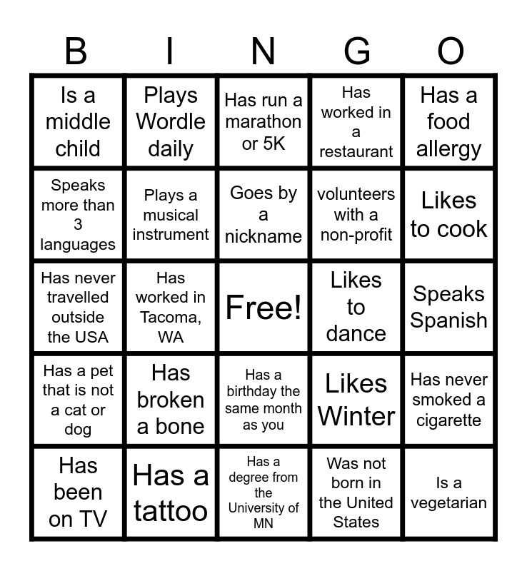 This bingo card has a free space and 34 words: Is left-handed, Was not born in the United States, Was not born in MN, Has visited more than 5 countries, Has a pet that is not a cat or dog, Plays a musical instrument, Has a food allergy, Has been on TV, Plays Wordle daily, Collects something, Goes by a nickname, Has run a marathon or 5K, Is afraid of heights, Can’t curl their tongue, Likes to dance, Likes to cook, Has a tattoo, Has never travelled outside the USA, Has broken a bone, Likes Winter, Has a birthday the same month as you, Can’t whistle, Is a middle child, Speaks Spanish, Has a degree from the University of MN, Is a vegetarian, Has worked in a restaurant, Sings in a choir, volunteers with a non-profit, Speaks more than 3 languages, Has lived in New York, Has worked in Tacoma, WA, Has never smoked a cigarette and Bikes to work daily.