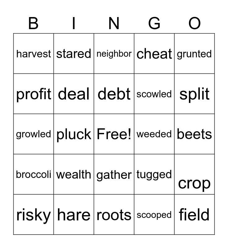 This bingo card has a free space and 24 words: wealth, hare, debt, risky, grunted, harvest, profit, stared, weeded, gather, scowled, growled, tugged, crop, deal, scooped, beets, neighbor, split, pluck, field, broccoli, cheat and roots.