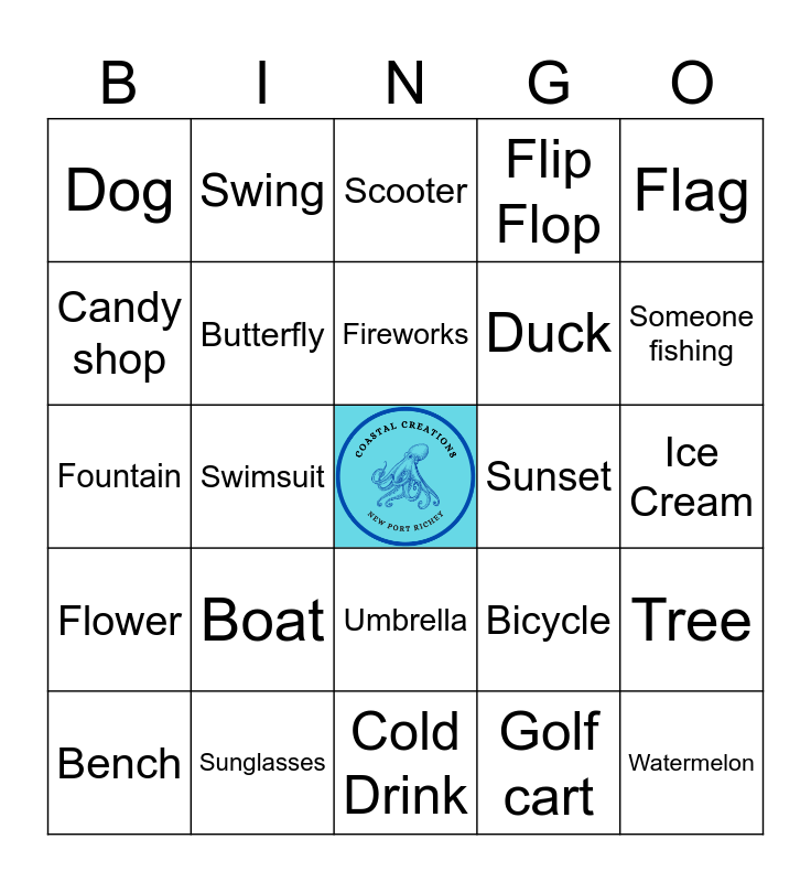 This bingo card has a free space and 24 words: Boat, Sunglasses, Fireworks, Bench, Flag, Dog, Candy shop, Swing, Sunset, Umbrella, Duck, Fountain, Bicycle, Tree, Butterfly, Golf cart, Ice Cream, Scooter, Someone fishing, Swimsuit, Watermelon, Flower, Flip Flop and Cold Drink.