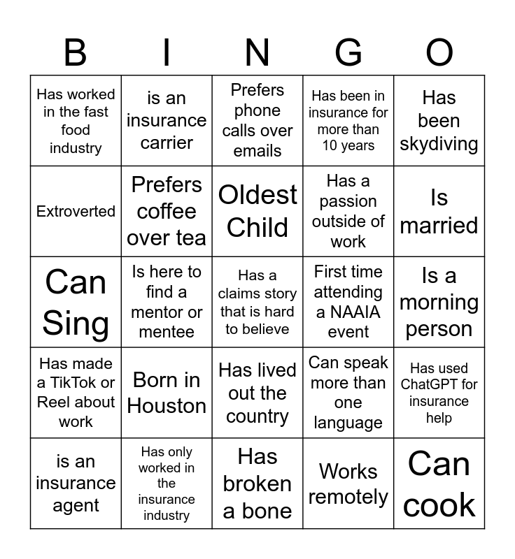 This bingo card has a free space and 24 words: Born in Houston, Has only worked in the insurance industry, Oldest Child, is an insurance agent, Has been skydiving, Has worked in the fast food industry, Extroverted, is an insurance carrier, First time attending a NAAIA event, Has lived out the country, Has a passion outside of work, Can Sing, Can speak more than one language, Has used ChatGPT for insurance help, Prefers coffee over tea, Works remotely, Is a morning person, Prefers phone calls over emails, Is married, Is here to find a mentor or mentee, Can cook, Has made a TikTok or Reel about work, Has been in insurance for more than 10 years and Has broken a bone.