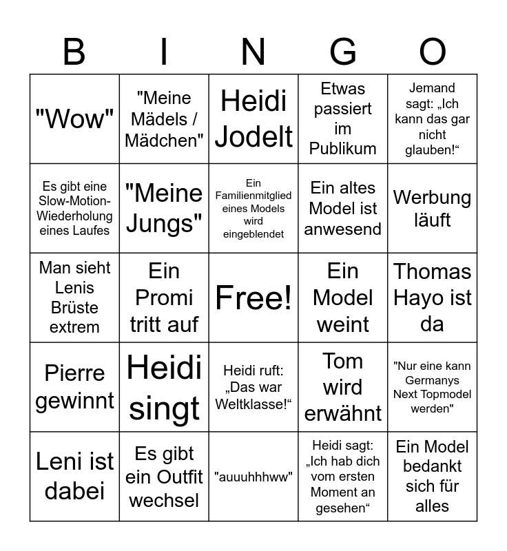 This bingo card has a free space and 24 words: Heidi singt, Es gibt ein Outfit wechsel, Ein Familienmitglied eines Models wird eingeblendet, Leni ist dabei, Jemand sagt: „Ich kann das gar nicht glauben!“, "Wow", Es gibt eine Slow-Motion-Wiederholung eines Laufes, "Meine Mädels / Mädchen", Ein Model weint, Heidi ruft: „Das war Weltklasse!“, Ein altes Model ist anwesend, Man sieht Lenis Brüste extrem, Tom wird erwähnt, "Nur eine kann Germanys Next Topmodel werden", "Meine Jungs", Heidi sagt: „Ich hab dich vom ersten Moment an gesehen“, Thomas Hayo ist da, Heidi Jodelt, Werbung läuft, Ein Promi tritt auf, Ein Model bedankt sich für alles, Pierre gewinnt, Etwas passiert im Publikum and "auuuhhhww".