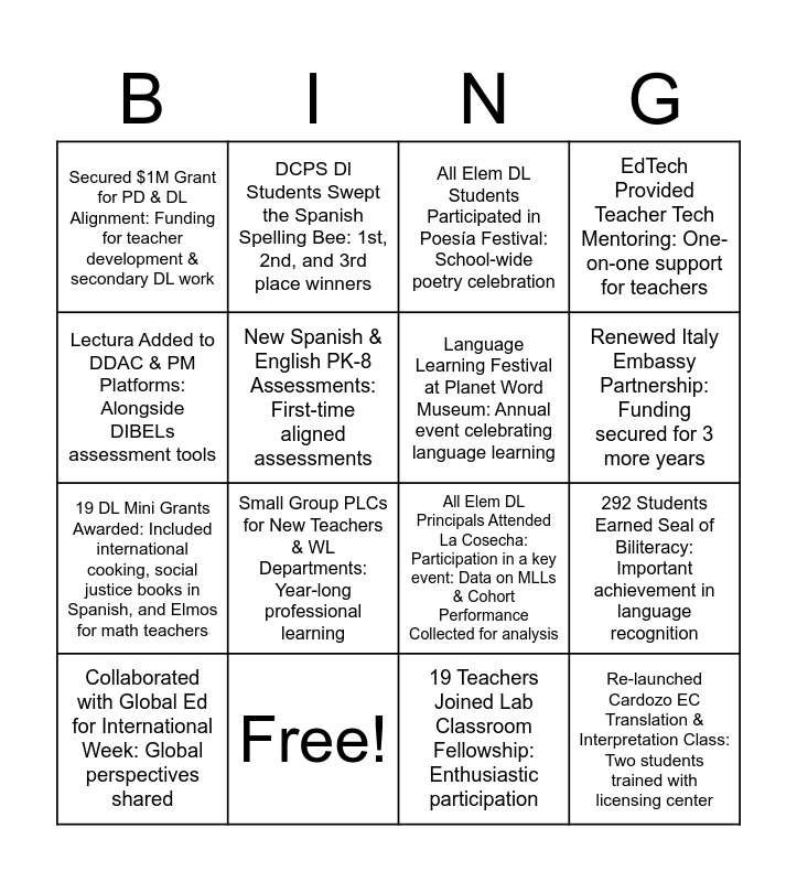 This bingo card has 16 words: Free!, 292 Students Earned Seal of Biliteracy: Important achievement in language recognition, All Elem DL Students Participated in Poesía Festival: School-wide poetry celebration, Secured $1M Grant for PD & DL Alignment: Funding for teacher development & secondary DL work, 19 DL Mini Grants Awarded: Included international cooking, social justice books in Spanish, and Elmos for math teachers, DCPS Dl Students Swept the Spanish Spelling Bee: 1st, 2nd, and 3rd place winners, All Elem DL Principals Attended La Cosecha: Participation in a key event: Data on MLLs & Cohort Performance Collected for analysis, 19 Teachers Joined Lab Classroom Fellowship: Enthusiastic participation, Lectura Added to DDAC & PM Platforms: Alongside DIBELs assessment tools, New Spanish & English PK-8 Assessments: First-time aligned assessments, Collaborated with Global Ed for International Week: Global perspectives shared, EdTech Provided Teacher Tech Mentoring: One-on-one support for teachers, Small Group PLCs for New Teachers & WL Departments: Year-long professional learning, Renewed Italy Embassy Partnership: Funding secured for 3 more years, Language Learning Festival at Planet Word Museum: Annual event celebrating language learning and Re-launched Cardozo EC Translation & Interpretation Class: Two students trained with licensing center.