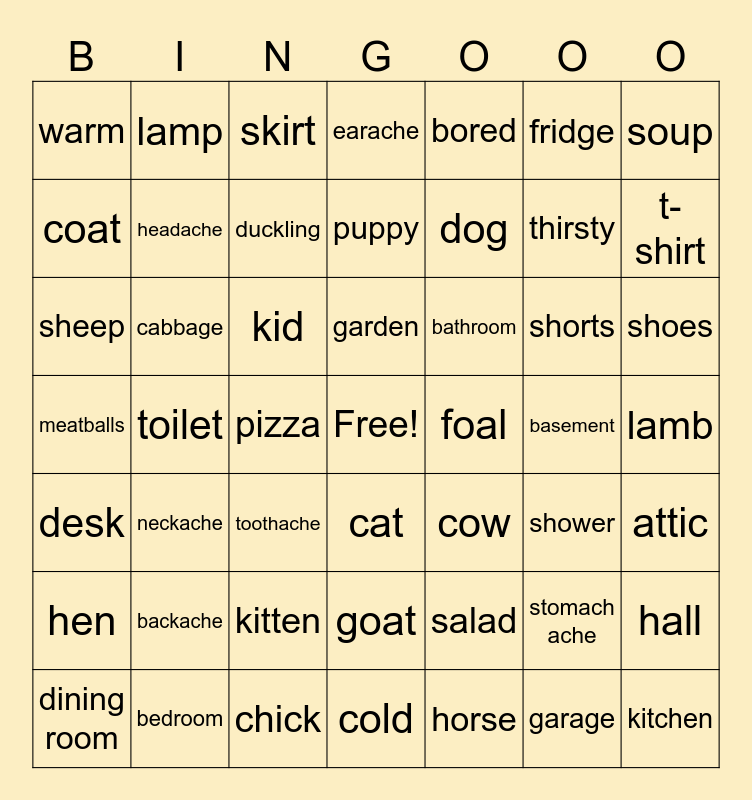 This bingo card has a free space and 58 words: pasta, meatballs, chips, cabbage, pizza, salad, soup, chicken, headache, stomach ache, earache, backache, toothache, neckache, cold, warm, thirsty, bored, hungry, coat, t-shirt, skirt, shoes, shorts, cap, sheep, lamb, duck, duckling, cow, calf, hen, chick, horse, foal, cat, kitten, dog, puppy, goat, kid, kitchen, bathroom, living room, hall, dining room, bedroom, garden, toilet, garage, attic, basement, desk, shower, lamp, cupboard, fridge and shelf.