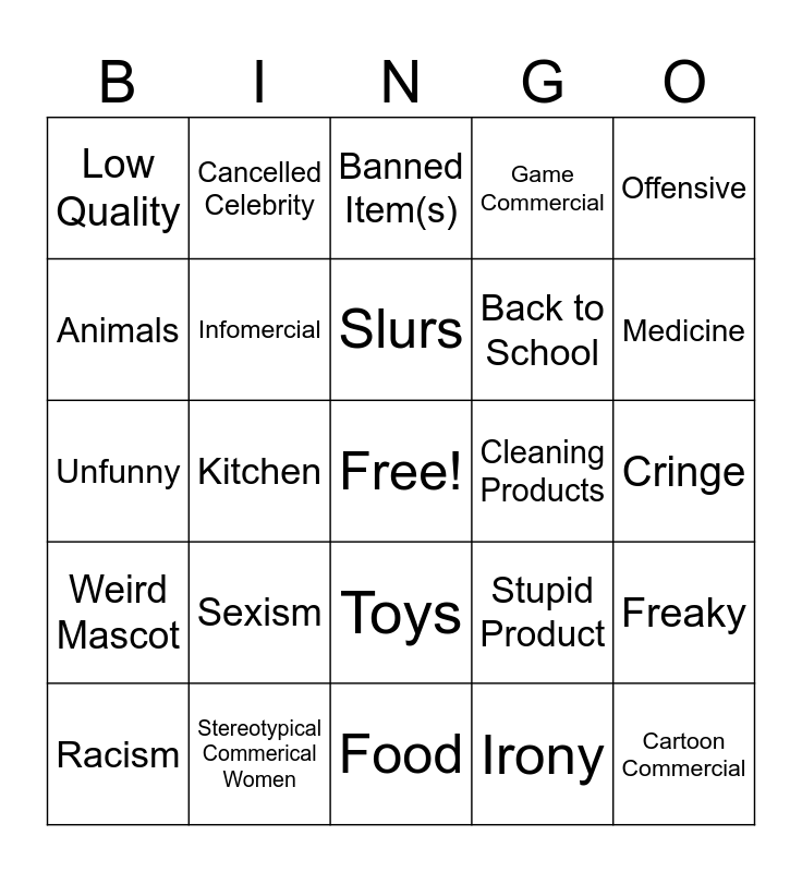This bingo card has a free space and 24 words: Racism, Sexism, Slurs, Irony, Offensive, Low Quality, Cancelled Celebrity, Banned Item(s), Cleaning Products, Cringe, Unfunny, Infomercial, Stupid Product, Freaky, Animals, Stereotypical Commerical Women, Food, Game Commercial, Medicine, Weird Mascot, Kitchen, Toys, Back to School and Cartoon Commercial.
