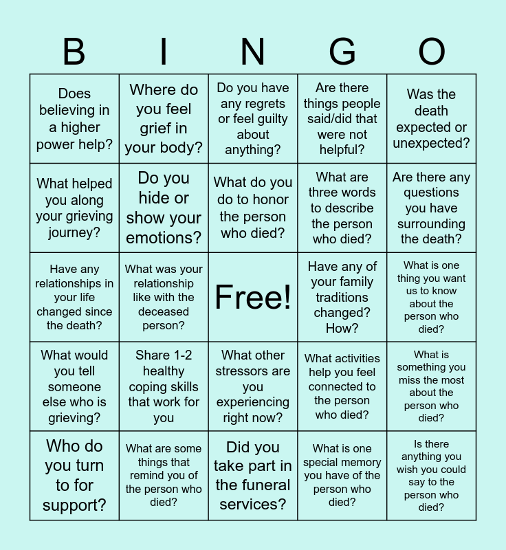 This bingo card has a free space and 24 words: Share 1-2 healthy coping skills that work for you, What are some things that remind you of the person who died?, What do you do to honor the person who died?, Who do you turn to for support?, Was the death expected or unexpected?, Does believing in a higher power help?, What helped you along your grieving journey?, Where do you feel grief in your body?, Have any of your family traditions changed? How?, What other stressors are you experiencing right now?, What are three words to describe the person who died?, Have any relationships in your life changed since the death?, What activities help you feel connected to the person who died?, What is something you miss the most about the person who died?, Do you hide or show your emotions?, What is one special memory you have of the person who died?, What is one thing you want us to know about the person who died?, Do you have any regrets or feel guilty about anything?, Are there any questions you have surrounding the death?, What was your relationship like with the deceased person?, Is there anything you wish you could say to the person who died?, What would you tell someone else who is grieving?, Are there things people said/did that were not helpful? and Did you take part in the funeral services?.