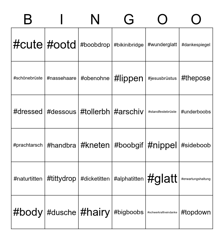 This bingo card has 36 words: #alphatitten, #dicketitten, #bigboobs, #schönebrüste, #prachtarsch, #arschiv, #nassehaare, #hairy, #wunderglatt, #glatt, #thepose, #bikinibridge, #erwartungshaltung, #dessous, #lippen, #cute, #naturtitten, #standfestebrüste, #dressed, #boobdrop, #tollerbh, #handbra, #boobgif, #kneten, #nippel, #ootd, #jesusbrüstus, #dusche, #obenohne, #dankespiegel, #topdown, #body, #sideboob, #underboobs, #tittydrop and #schwerkraftneindanke.