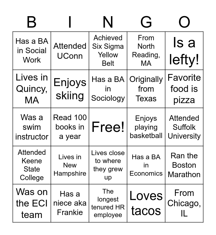 This bingo card has a free space and 24 words: Lives in New Hampshire, Has a niece aka Frankie, Has a BA in Sociology, Was on the ECI team, Is a lefty!, Has a BA in Social Work, Lives in Quincy, MA, Attended UConn, Enjoys playing basketball, Lives close to where they grew up, Originally from Texas, Was a swim instructor, Has a BA in Economics, Ran the Boston Marathon, Enjoys skiing, Loves tacos, Attended Suffolk University, Achieved Six Sigma Yellow Belt, Favorite food is pizza, Read 100 books in a year, From Chicago, IL, Attended Keene State College, From North Reading, MA and The longest tenured HR employee.