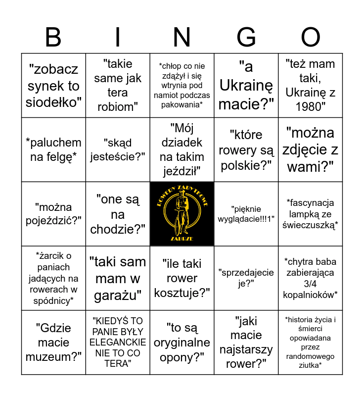 This bingo card has a free space and 24 words: "taki sam mam w garażu", "KIEDYŚ TO PANIE BYŁY ELEGANCKIE NIE TO CO TERA", "Mój dziadek na takim jeździł", "Gdzie macie muzeum?", "też mam taki, Ukrainę z 1980", "zobacz synek to siodełko", *paluchem na felgę*, "takie same jak tera robiom", "pięknie wyglądacie!!!1", "ile taki rower kosztuje?", "które rowery są polskie?", "można pojeździć?", "sprzedajecie je?", *chytra baba zabierająca 3/4 kopalnioków*, "skąd jesteście?", "jaki macie najstarszy rower?", *fascynacja lampką ze świeczuszką*, *chłop co nie zdążył i się wtrynia pod namiot podczas pakowania*, "można zdjęcie z wami?", "one są na chodzie?", *historia życia i śmierci opowiadana przez randomowego ziutka*, *żarcik o paniach jadących na rowerach w spódnicy*, "a Ukrainę macie?" and "to są oryginalne opony?".