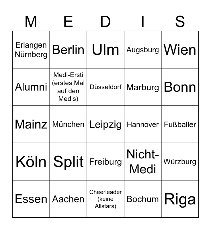 This bingo card has 25 words: Köln, Aachen, Leipzig, Bochum, Wien, Erlangen Nürnberg, Berlin, Ulm, Hannover, Würzburg, Alumni, Medi-Ersti (erstes Mal auf den Medis), Cheerleader (keine Allstars), Nicht-Medi, Bonn, Essen, München, Düsseldorf, Marburg, Fußballer, Mainz, Split, Freiburg, Augsburg and Riga.