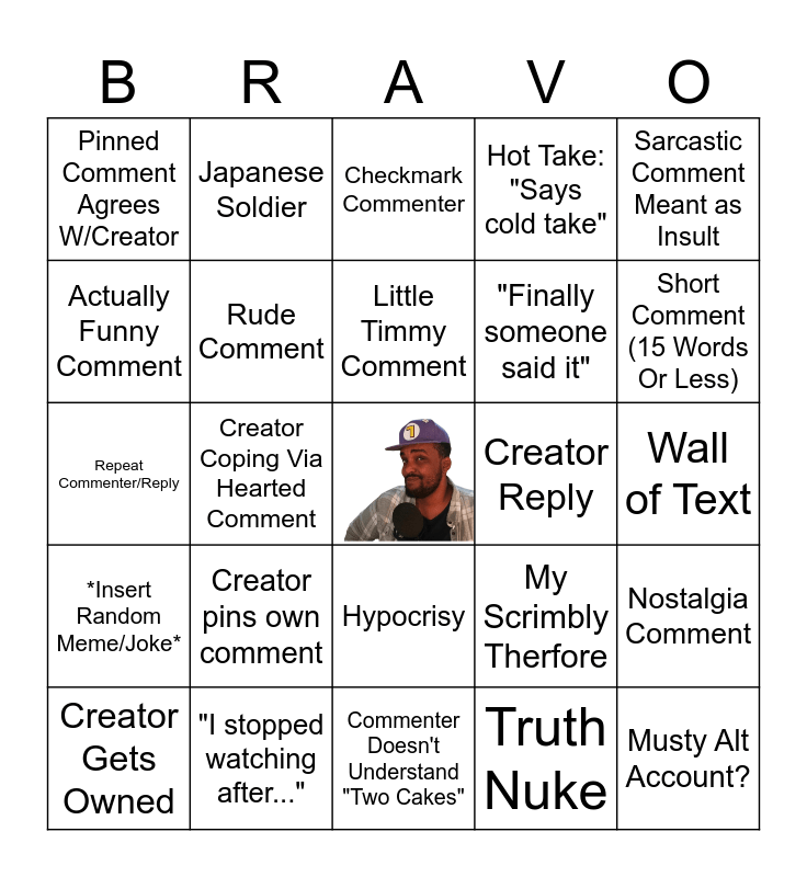 This bingo card has a free space and 59 words: Fighting in the Trenches (Replies), "I stopped watching after...", "Am I the only one who...", *Insert Random Meme/Joke*, Truth Nuke, Emoji Spam, Rude Comment, Buzzword Barry Comment, "Finally someone said it", Who Cares Comment?, Hot Take: "Says cold take", Comment Glazing Creator, Actually Funny Comment, Respectful Comment, Grammar Mistake, Pinned Comment Agrees W/Creator, Musty Alt Account?, Sarcastic Comment Meant as Insult, Rage bait, Little Timmy Comment, Creator Reply, Checkmark Commenter, Creator Gets Owned, Nostalgia Comment, "People Online", Boomer/Unc, Essay, "Racism", Short Comment (15 Words Or Less), Me when I lie, Comment Made Better Arguments Than Video, Ratio, Unsubscribed Comment, "Video Game Industry", Japanese Soldier, Fatality Response from Commenter, Goomba Fallacy, Creator Coping Via Hearted Comment, Needless Political Mention, Repeat Commenter/Reply, Default Dan Comment, Creator pins own comment, Wall of Text, Cringe Comment, Hearted Comment, "___ btw", Random Parting Shot at Pokemon, Mustyism's, Hypocrisy, Commenter Doesn't Understand "Two Cakes", "Call me a __ But...", No Joy, No Whimsy, Schizoposting, Comment Unrelated to Video, Elitist, My Scrimbly Therfore, "Look Gary There I am!", Actually Controversial Opinion and Wholesome Comment.