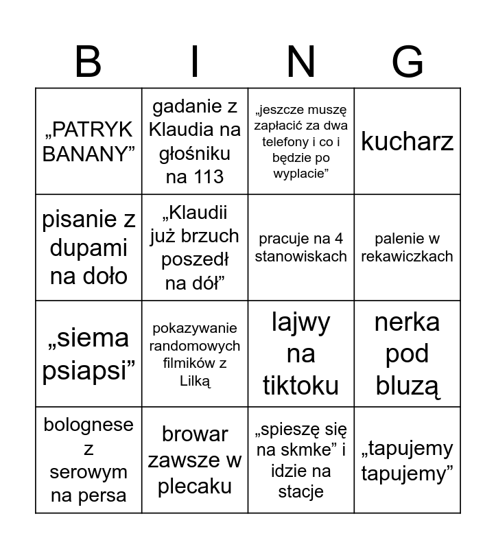 This bingo card has 16 words: browar zawsze w plecaku, nerka pod bluzą, „jeszcze muszę zapłacić za dwa telefony i co i będzie po wyplacie”, „PATRYK BANANY”, „siema psiapsi”, gadanie z Klaudia na głośniku na 113, lajwy na tiktoku, „spieszę się na skmke” i idzie na stacje, pisanie z dupami na doło, „Klaudii już brzuch poszedł na dół”, bolognese z serowym na persa, kucharz, pokazywanie randomowych filmików z Lilką, palenie w rekawiczkach, pracuje na 4 stanowiskach and „tapujemy tapujemy”.