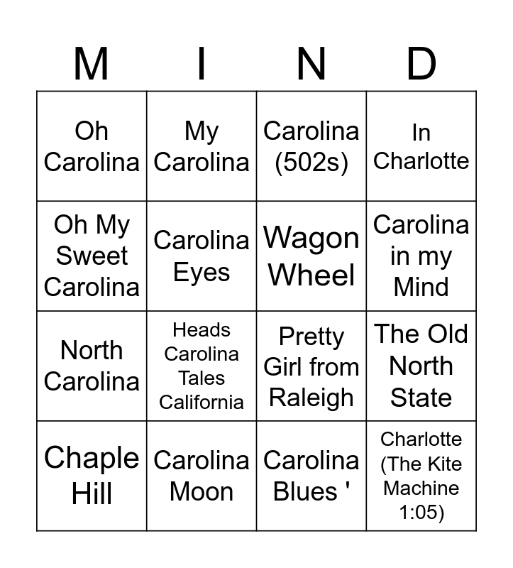 This bingo card has 25 words: CAROLINA (Parmalee), carolina (Eric Church), Carolina in my Mind, Carolina Can, Oh My Sweet Carolina, Oh Carolina, Carolina Eyes, My Carolina, Carolina Moon, Carolina Boys, North Carolina, Pretty Girl from Raleigh, Carolin Girl, Greensboro Woman, Wagon Wheel, Carolina Early in the Morning, Carolina Blues ', Carolina (502s), Heads Carolina Tales California, The Old North State, Chaple Hill, Salisbury Town, Charlotte (The Kite Machine 1:05), In Charlotte and SOUNDS OF SALISBURY.