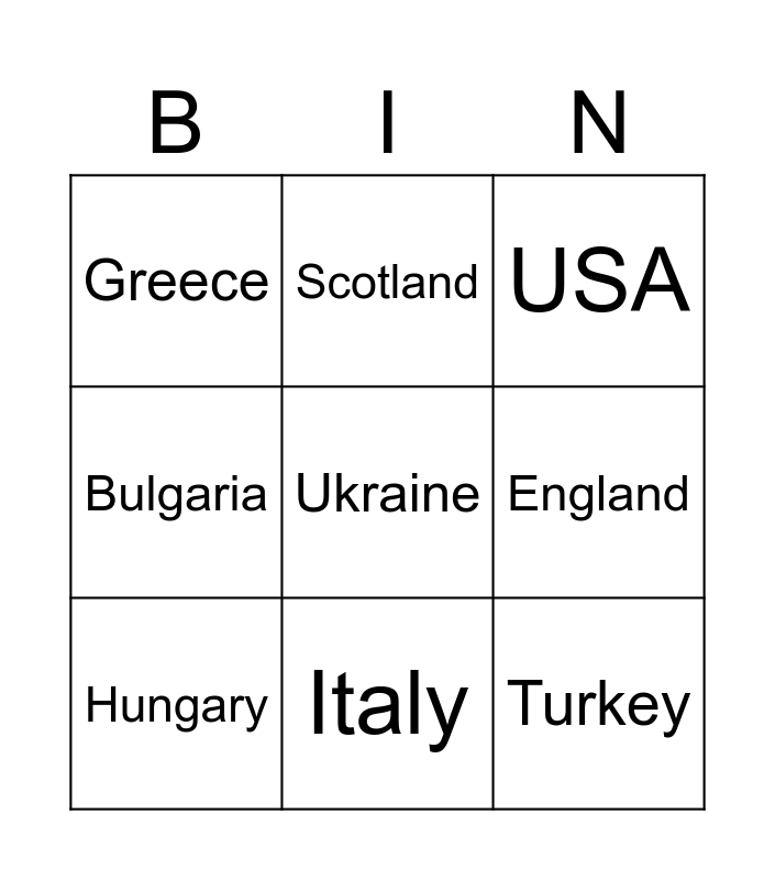This bingo card has a free space and 8 words: England, USA, Scotland, Hungary, Greece, Turkey, Bulgaria and Italy.