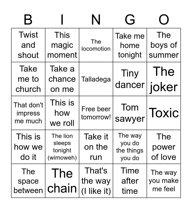 This bingo card has a free space and 35 words: Tainted love, Take it easy, Take on me, Take a chance on me, Take it on the run, Take me home tonight, Take me to church, Talk dirty to me, Talladega, Teenage dream, That don't impress me much, The boys of summer, The boys are back in town, Tubthumping, Twist and shout, Tom sawyer, Time after time, This is how we roll, This is how we do it, The way you make me feel, The way you do the things you do, The space between, The power of love, The chain, The locomotion, The joker, The middle, Take a back road, Tiny dancer, Toxic, Takin' care of business, That's the way (I like it), The lion sleeps tonight (wimoweh), This magic moment and Too little too late.