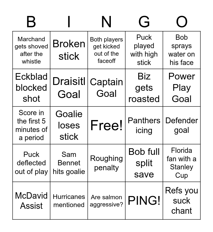 This bingo card has a free space and 24 words: Sam Bennet hits goalie, Hurricanes mentioned, Captain Goal, McDavid Assist, Bob sprays water on his face, Marchand gets shoved after the whistle, Eckblad blocked shot, Broken stick, Panthers icing, Roughing penalty, Biz gets roasted, Score in the first 5 minutes of a period, Bob full split save, Florida fan with a Stanley Cup, Draisitl Goal, PING!, Defender goal, Both players get kicked out of the faceoff, Power Play Goal, Goalie loses stick, Refs you suck chant, Puck deflected out of play, Puck played with high stick and Are salmon aggressive?.