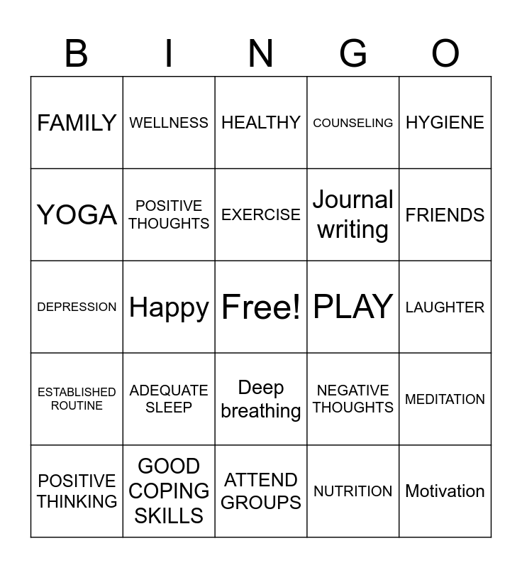 This bingo card has a free space and 24 words: POSITIVE THINKING, ADEQUATE SLEEP, EXERCISE, NUTRITION, HYGIENE, FAMILY, WELLNESS, HEALTHY, PLAY, LAUGHTER, DEPRESSION, POSITIVE THOUGHTS, NEGATIVE THOUGHTS, MEDITATION, YOGA, GOOD COPING SKILLS, ATTEND GROUPS, COUNSELING, FRIENDS, ESTABLISHED ROUTINE, Happy, Deep breathing, Journal writing and Motivation.